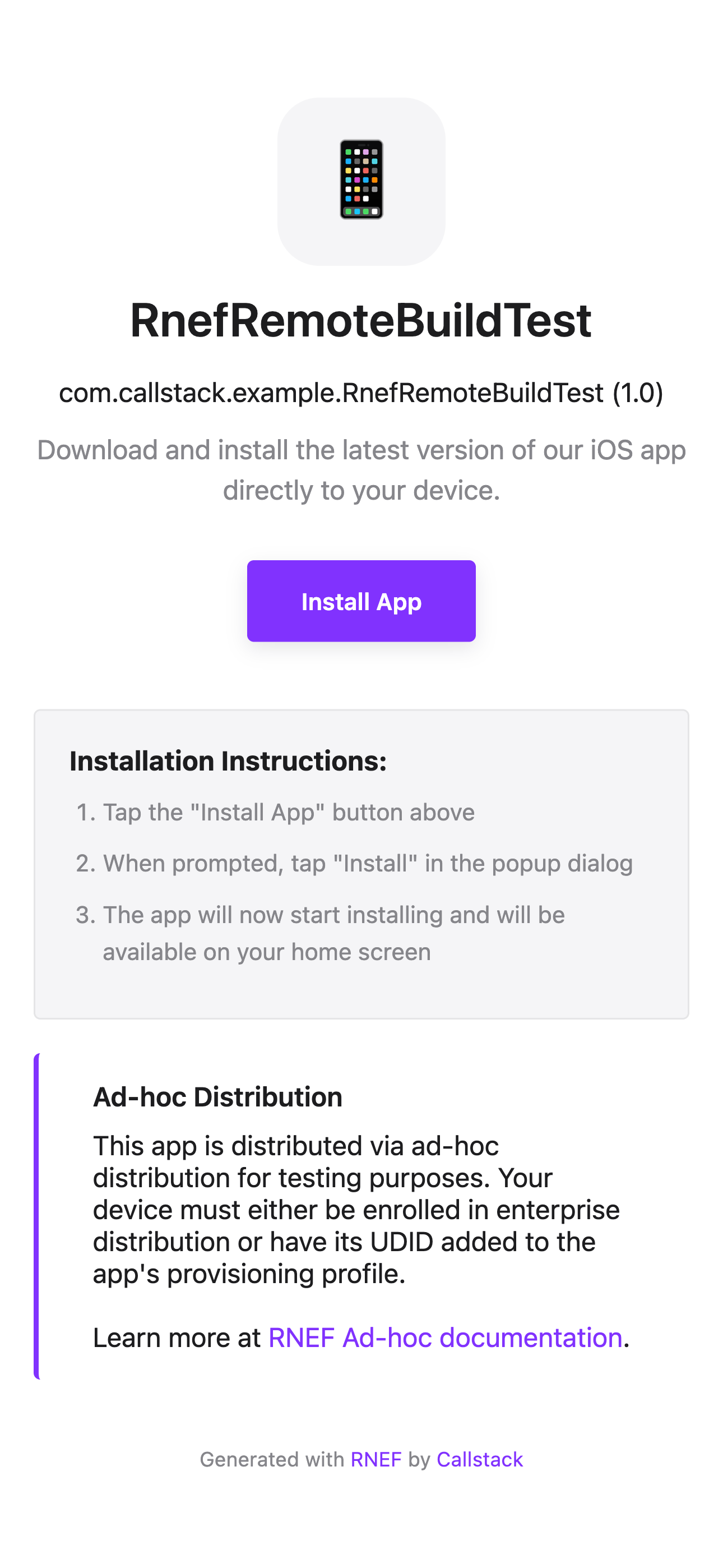 This index.html file will display an ad-hoc distribution web portal, allowing developers and testers to install apps on their provisioned devices by simply clicking "Install App".